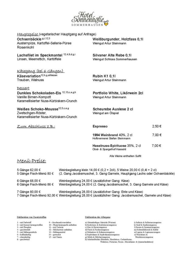 Wir bieten in unseren Restaurant ein 5 Gänge-Verwöhn-Menü mit Sommerhäuser Weinbegleitung an. Das Menü kann bis auf 7 Gänge erweitert werden.