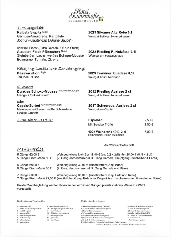 5 Gänge-Verwöhn-Menü mit einigen Auswahloptionen zu den einzelnen Gängen. Dazu können Sie eine Weinbegleitung mit Weinen aus Sommerhausen oder auch eine alkholfreie auf das Menü abgestimmte Getränkebegleitung genießen. Das Menü kann bis auf 7 Gänge erweitert werden.