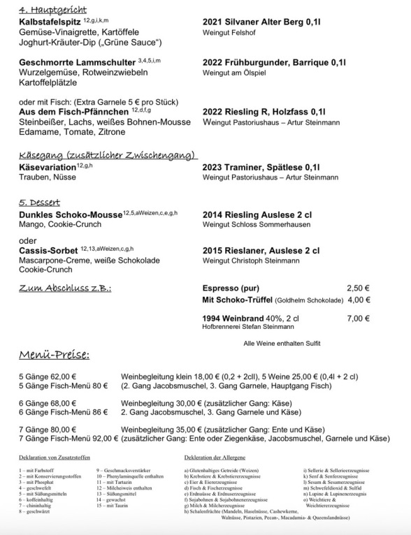 Wir servieren unser 5-Gänge-Verwöhn-Menü. Wer traditionell an diesen Tagen auf Fisch setzen möchte findet zu jedem Gang eine entsprechende Option.